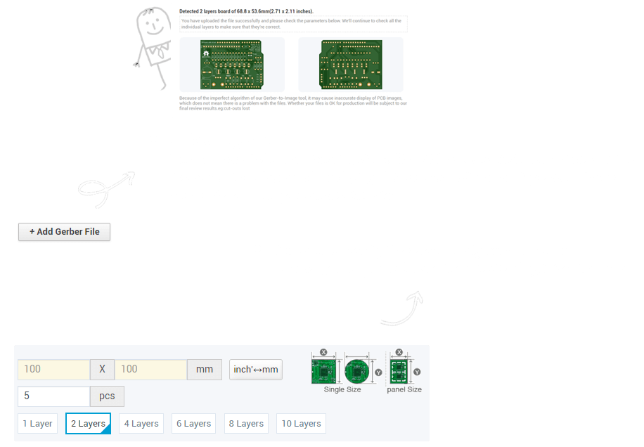 Automatically sets the board size,hole,track/spacing.only accept .rar, .zip or .7z & Maximum 50M.